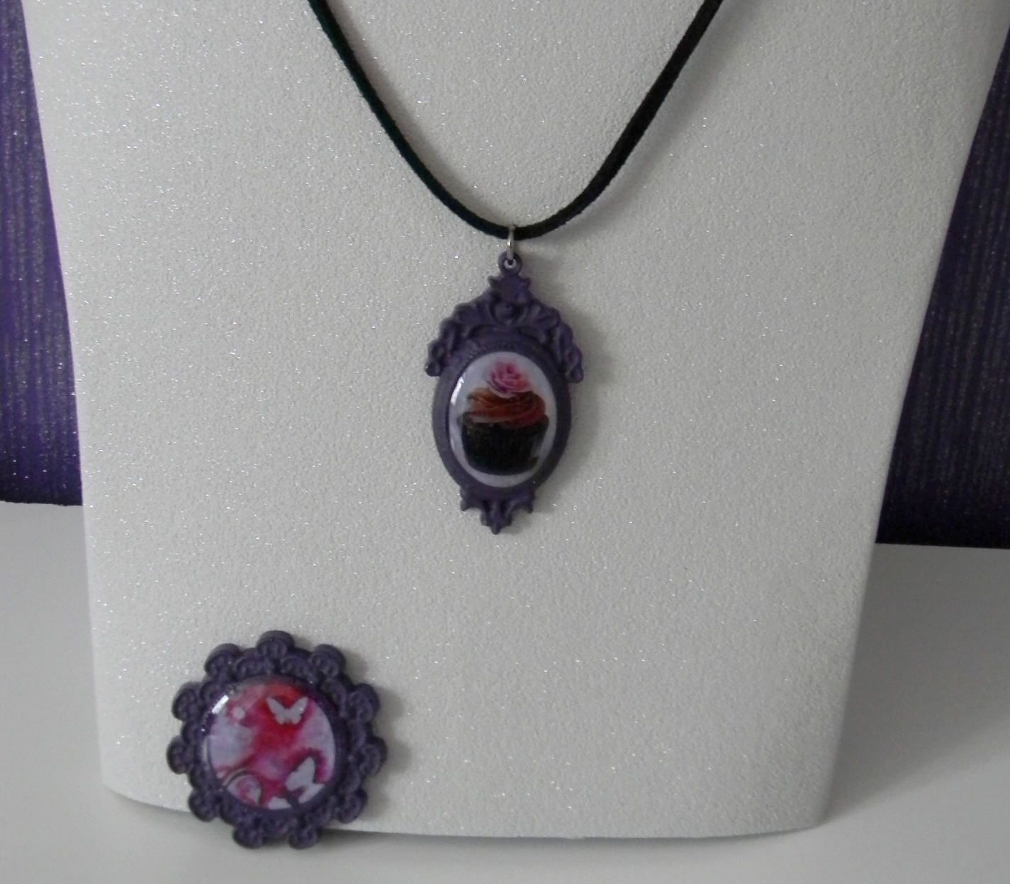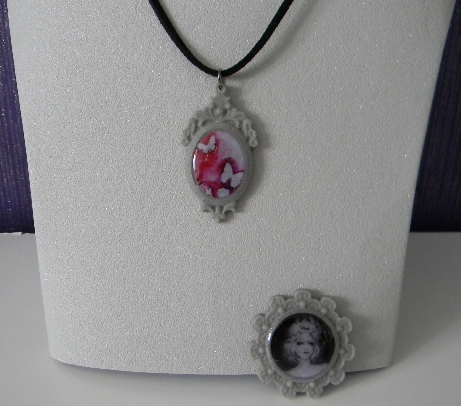 Médaillons et broches réalisés avec de la résine cristal Pebeo colorée et recouverts de résine de glaçage.